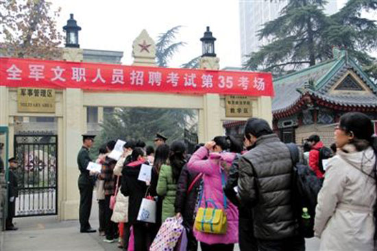 12月15日,在解放軍南京政治學(xué)院考點,考生等候進場參加考試。當(dāng)日,軍隊首次統(tǒng)一招聘文職人員考試舉行,據(jù)解放軍總政治部有關(guān)部門介紹,共有10萬余人報名應(yīng)聘,報名和錄取比例平均為38∶1。
